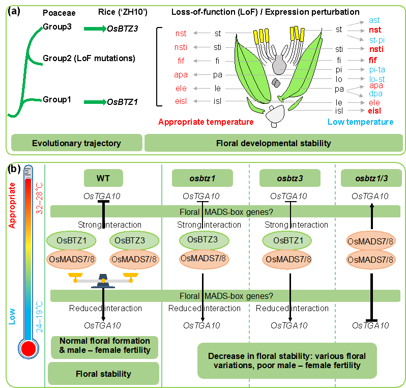 上述研究结果阐明了水稻两个BTZ同源基因在温度波动时维持花发育稳定性的分子机理及其功能分化机制,为理解EJC参与植物发育和适应性进化提供了新例证与新见解。