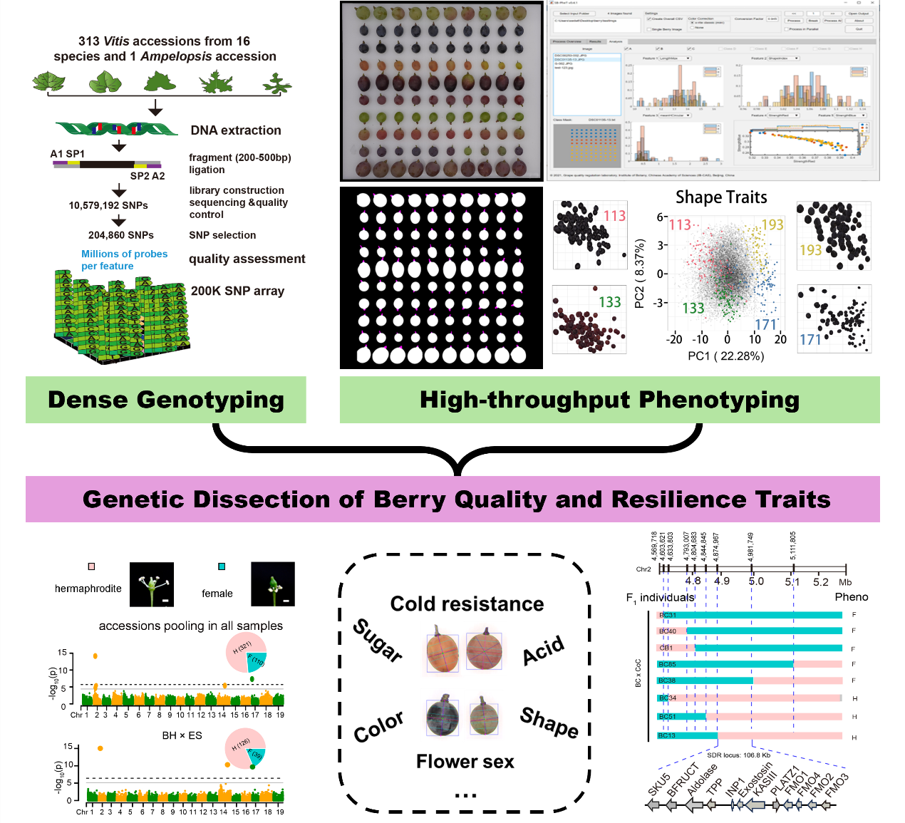 随着全球气候变化加剧,葡萄产业面临极端气候频发导致的多种环境胁迫及糖酸失衡、花色苷含量下降等严峻挑战,亟需培育具有自主知识产权的高环境韧性、高品质新品种。然而,葡萄童期较长、杂合度高,导致传统育种周期长、效率低,而现有分子标记密度不足制约着复杂性状的精细定位及其在多性状聚合育种中的应用。此外,复杂性状的表型高通量精准获取也成为育种中的瓶颈问题。因此,开发高精度分子标记和高通量表型获取工具,解析环境韧性和品质性状遗传网络,对加速葡萄品种改良具有重要意义。