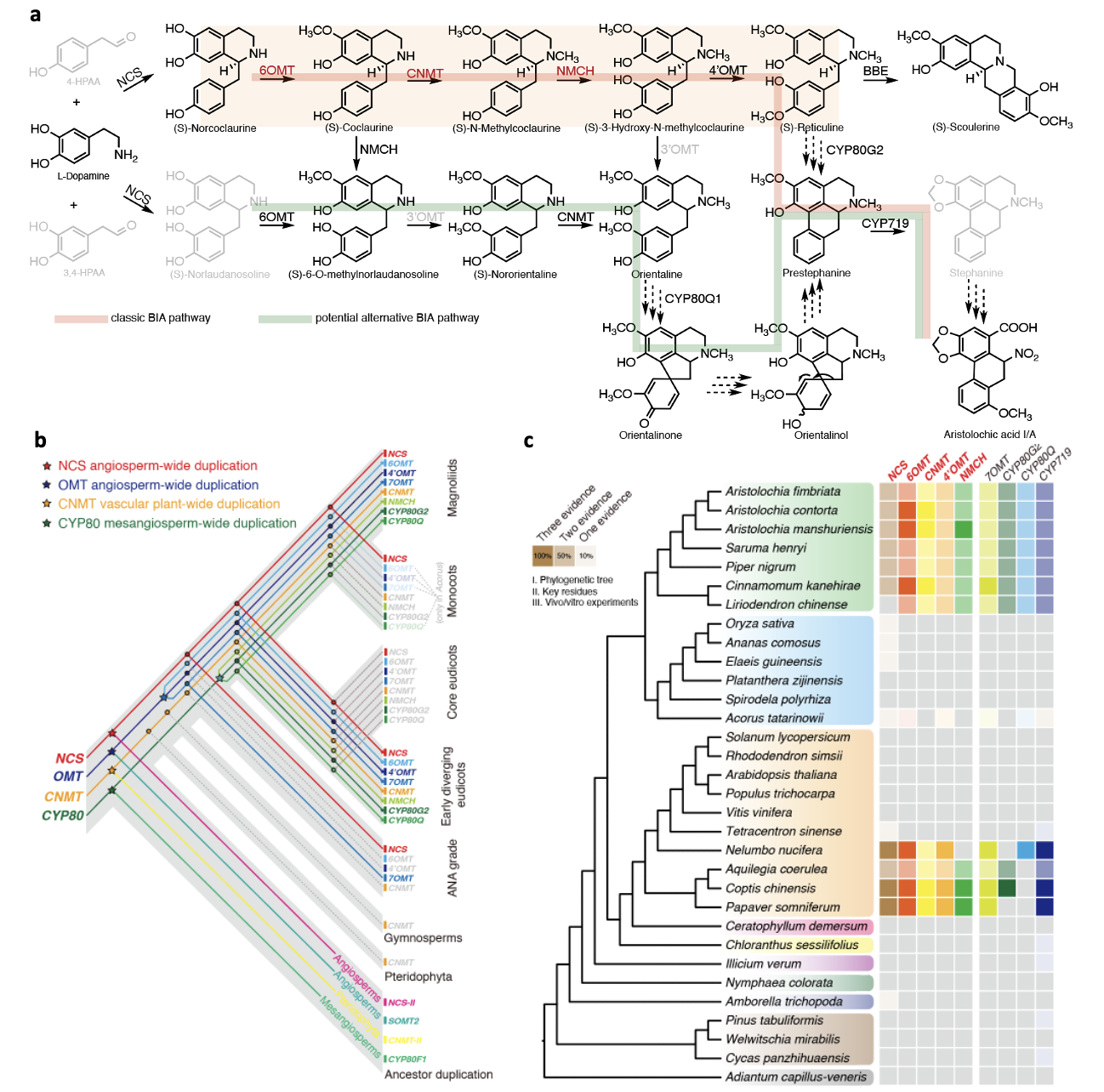 研究人员通过多组学联合分析,厘清了木通马兜铃中BIAs生物合成的遗传途径。通过烟草异源表达体系,研究人员验证了CNMT、6OMT和NMCH等关键基因在BIAs生物合成通路中的功能。进一步通过进化基因组学研究探讨了BIAs合成途径的起源和演化历史。研究发现BIAs合成相关基因多数起源于被子植物分化前的古老基因重复事件,但只有基部真双子叶植物和木兰类植物通过选择性保留这些重复基因而维持了BIAs的合成能力。相比之下,单子叶植物和核心真双子叶植物则因这些关键基因的特异性丢失而丧失了BIAs生物合成潜能。因此,本研究发现古老重复基因的偏好性保留和差异丢失是BIAs趋同演化的主要原因。