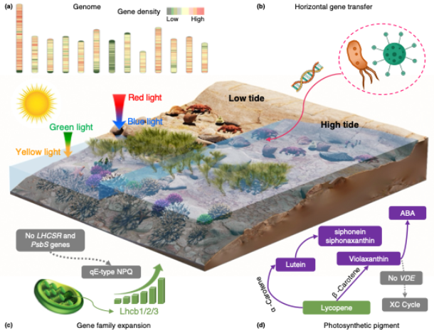 假根羽藻(Bryopsis corticulans)是一种在北温带海洋潮间带广泛分布的大型绿藻。假根羽藻的生存需适应不断变化的潮汐、温度以及紫外线辐射等多种环境因素。涨潮时,假根羽藻的光合蛋白可以在蓝绿光和绿光为主的弱光环境中充分捕获光能以满足自身生长需要,并在落潮时进行有效的光保护,以抵御高光强胁迫。近二十年来,植物所科研人员已对假根羽藻的色素组成、光合膜蛋白结构与功能进行了系统性的研究,然而关于假根羽藻适应潮间带环境的基因组和遗传基础,仍缺乏全面认识和深入研究。