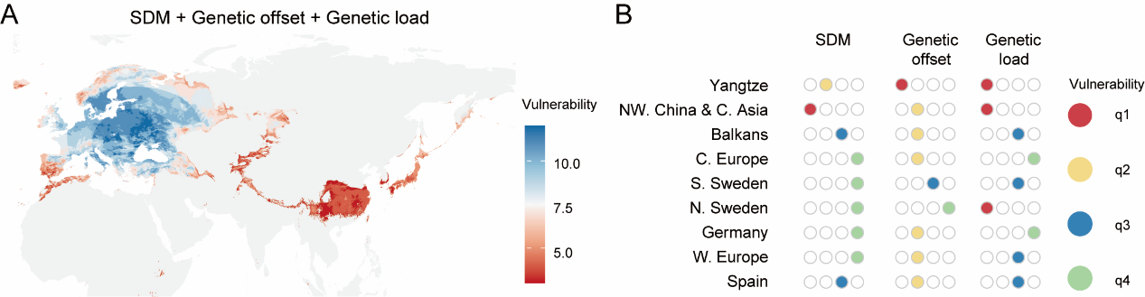 A,拟南芥气候变化响应能力(红色代表响应能力低);B,综合三种因素预测拟南芥不同群体应对气候变化的能力。