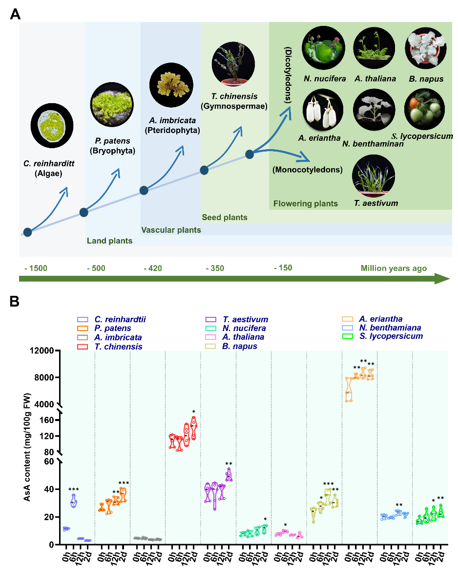 图1不同进化地位的植物(A)在冷胁迫下AsA浓度(B)的变化