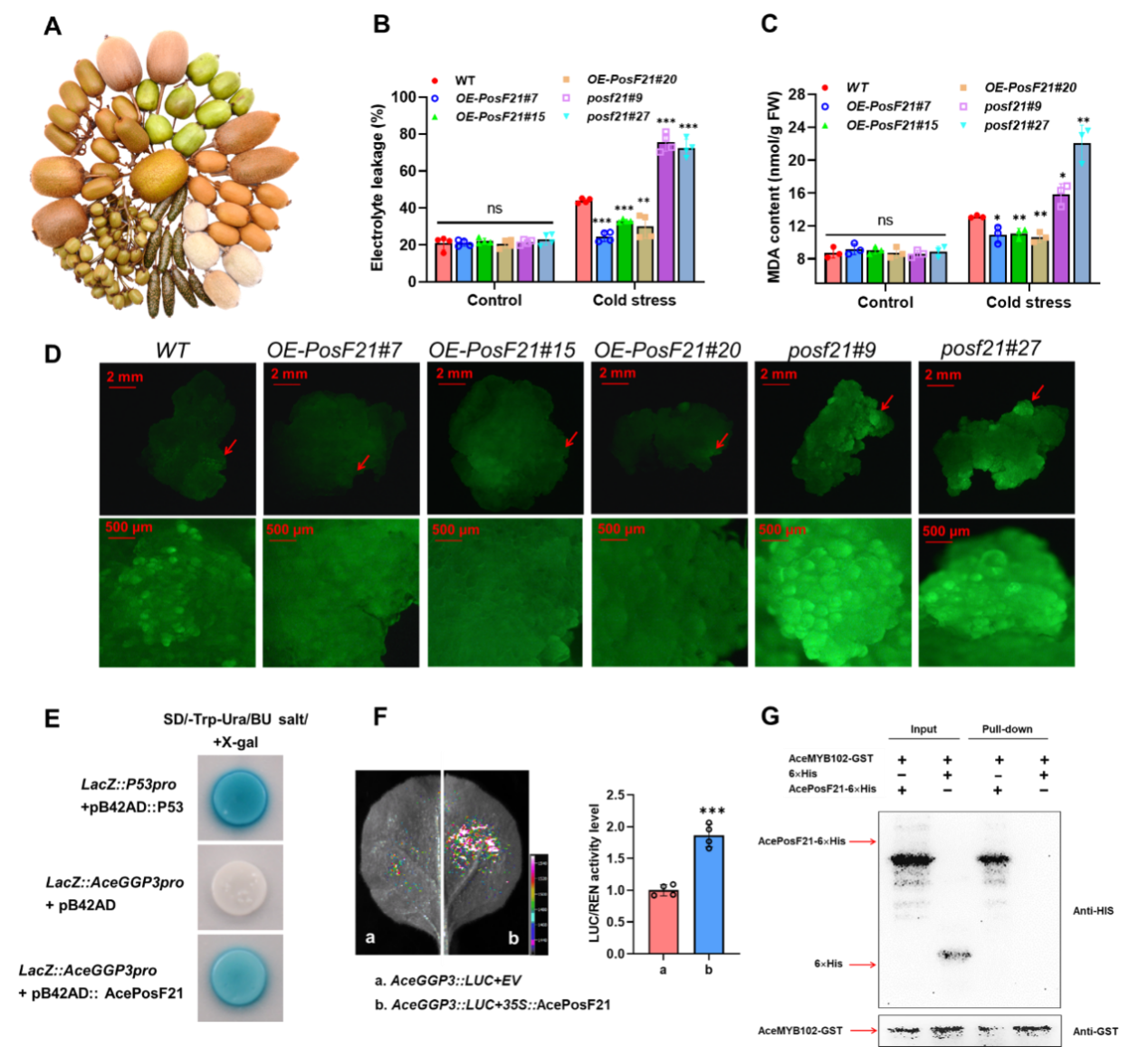 通过分析从单细胞到被子植物在冷胁迫下叶、果等组织的维生素C含量变化,研究团队发现,冷胁迫短时间内能够诱导大部分植物维生素C的合成。利用高维生素C的猕猴桃为材料,成功发掘了一个bZIP家族的转录因子AcePosF21,该转录因子能够被低温信号触发,对猕猴桃维生素C的生物合成和防御反应具有重要的调控作用。此外,研究团队利用VIGS诱导的基因沉默或CRISPR/Cas9介导的编辑,也证实了AcePosF21的缺失会降低了猕猴桃维生素C浓度,增加了ROS的生成。研究团队还发现AcePosF21能够与R2R3-MYB转录因子AceMYB102相互作用,直接结合到维生素C合成的关键基因AceGGP3启动子区、激活AceGGP3基因的表达;AceGGP3基因的高表达能够促进维生素C的合成并清除冷胁迫诱导的过量ROS,最终减缓猕猴桃冷损伤。