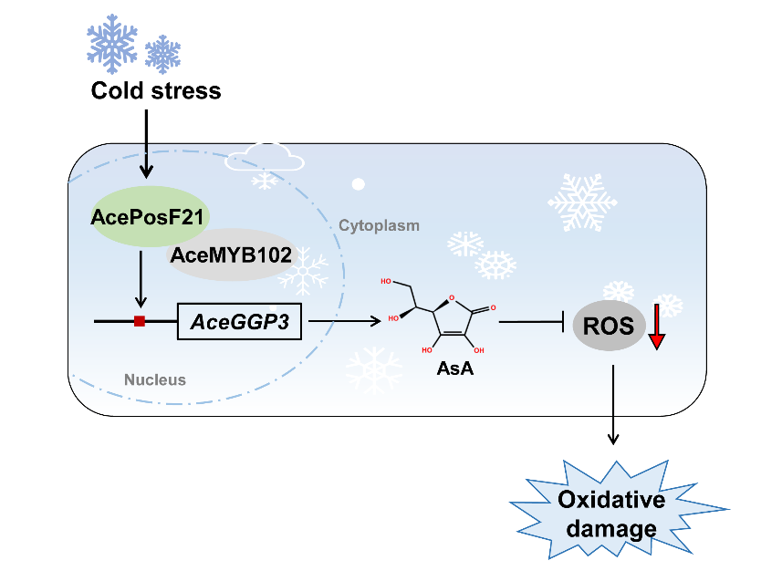 图3 AcePosF21介导的AsA生物合成和冷胁迫响应的工作模型
