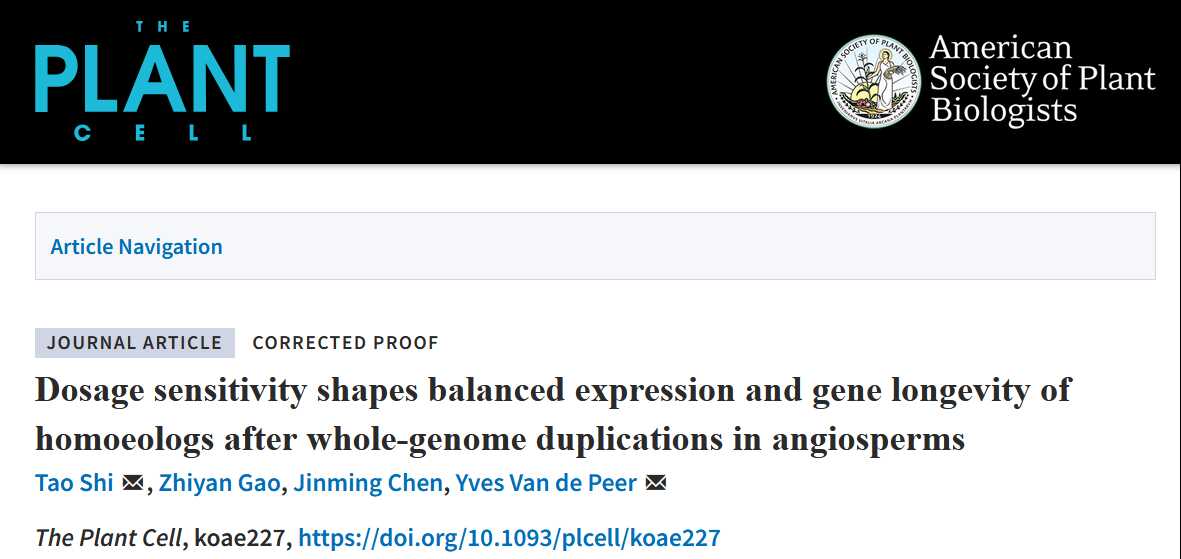 研究成果以“Dosage sensitivity shapes balanced expression and gene longevity of homoeologs after whole-genome duplications in angiosperms”为题发表在国际期刊The Plant Cell上。该研究得到了国家自然科学基金面上项目(32170240)和湖北省自然科学基金青年项目(2024AFB314)的资助。