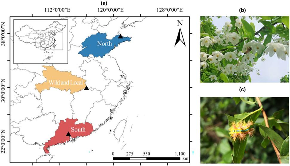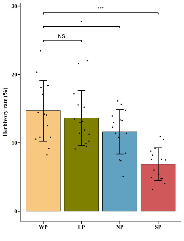 野生种群、近地迁地种群和北方迁地种群的主要植食动物是 刺蛾科幼虫,而在南方迁地种群中观测到的唯一植食动物是蜗牛。与野生种群相比,近地迁地种群的叶片虫食率无显著变化,而北方和南方迁地种群的叶片虫食率均显著降低;叶片防御性状(总酚含量、丹宁含量、叶片厚度和叶片干物质含量)在三个迁地种群中显著升高或者无显著变化。