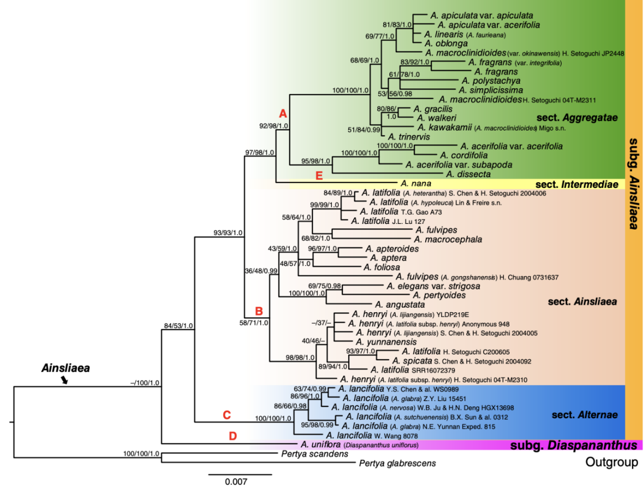 近期,重点实验室科研团队在菊科兔儿风属(Ainsliaea DC.)的系统学研究中取得了显著进展,为这一复杂属的分类争议提供了清晰的解答。作为菊科帚菊亚科中最大的一个属,兔儿风属广泛分布于东亚及喜马拉雅地区,是多种植物群落中的关键组成部分,具有重要的生态价值与科研意义。