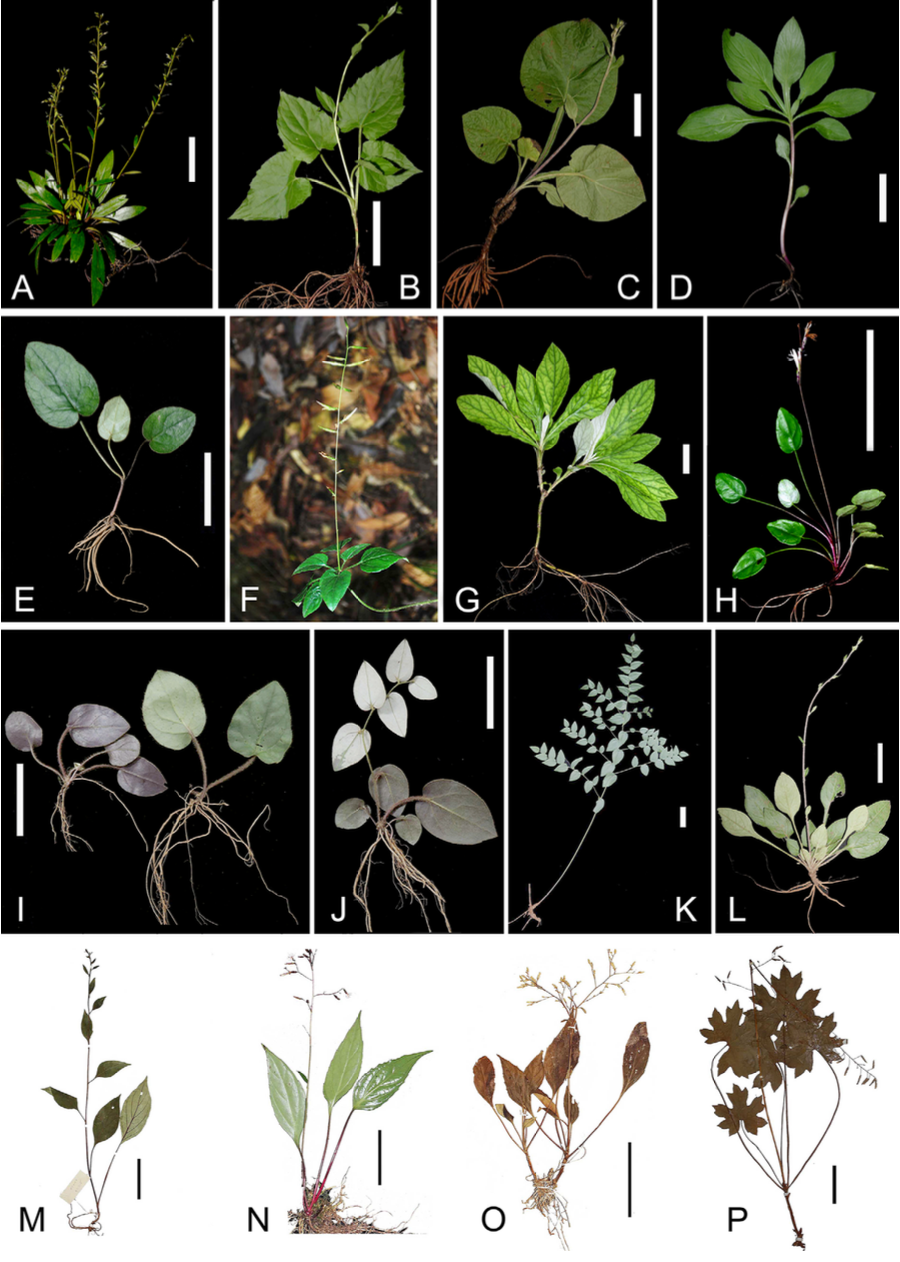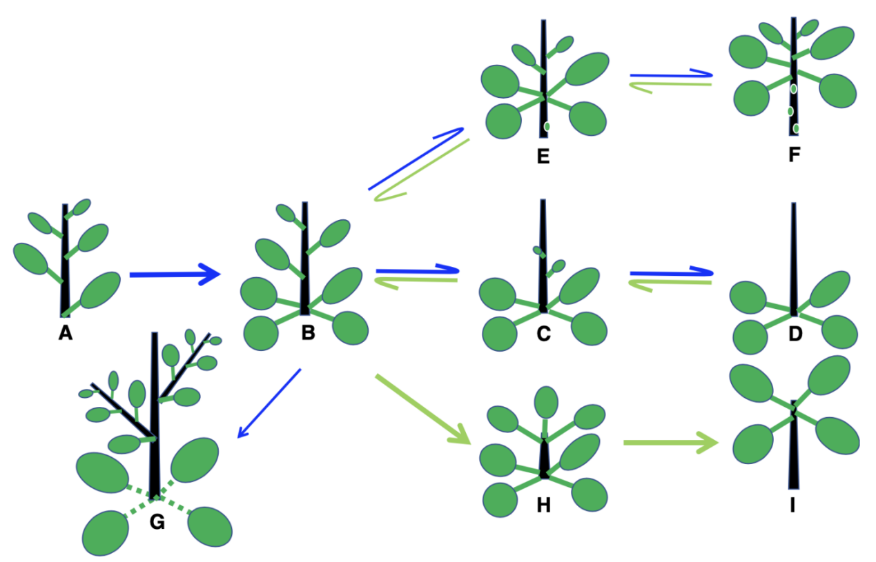 研究过程中,科研团队在四川卧龙自然保护区与黄龙自然保护区重新发现了小兔儿风(A. nana;图2),这是该物种自60多年前最后一次采集以来的再次重新确认,证实其为四川西部的濒危特有种。通过对小兔儿风以及其他争议物种的生长习性(也即叶排列方式)变异进行细致的观察(图3),研究者们揭示了兔儿风属生长习性演化的复杂模式,并总结出四条演化路径(图4)。这一工作不仅重新确认了生长习性作为兔儿风属分类的一个“好”性状,同时也提示该性状存在变异的可塑性以及在一些特殊生长阶段或特定生境下可能存在的平行演化,为分类学研究奠定了坚实的基础。
