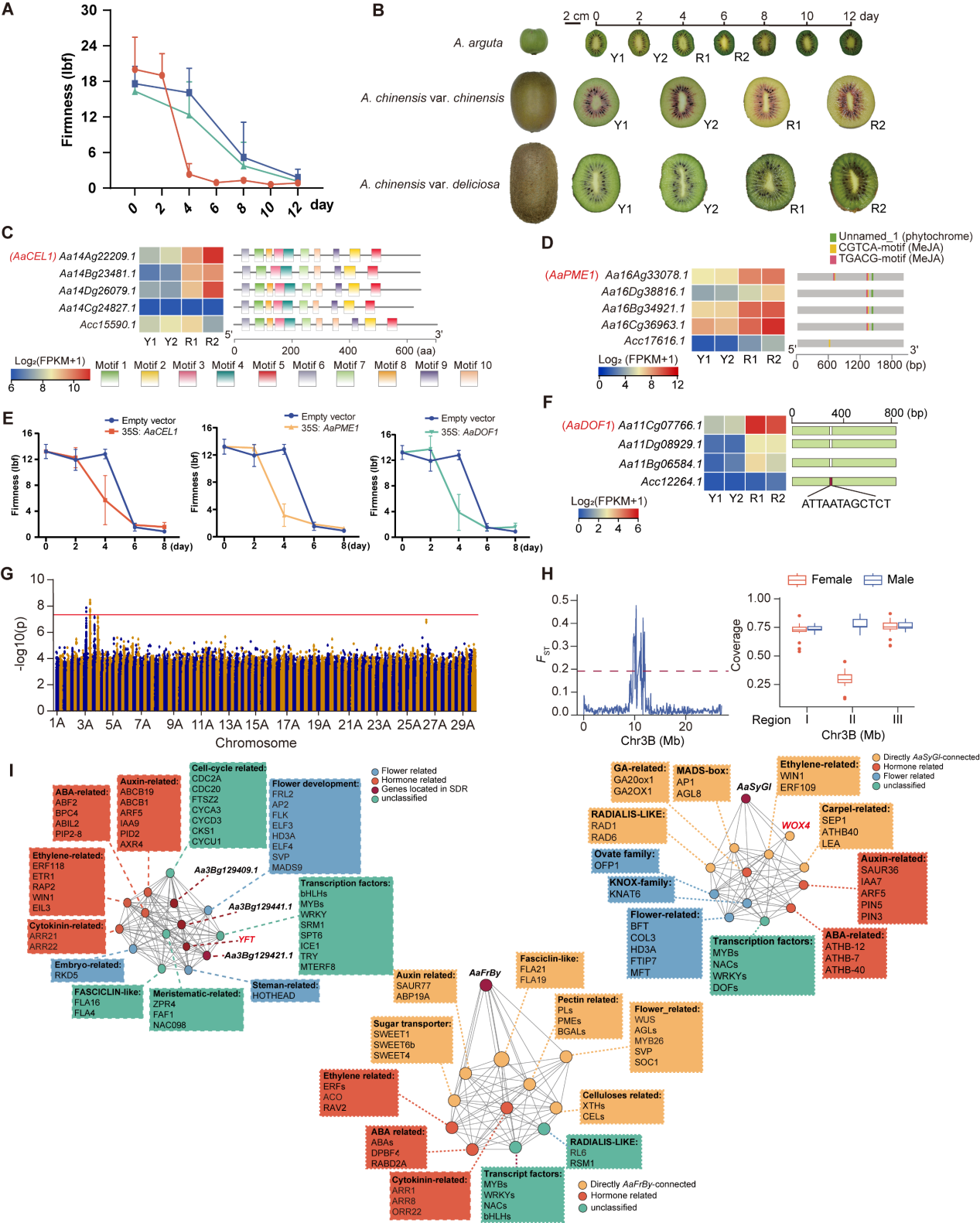 该研究构建了高质量的软枣猕猴桃四倍体雄株基因组,并确定了其为同源四倍体以及四倍体形成时间。该研究收集了覆盖我国、日本以及俄罗斯在内几乎所有原生地的软枣猕猴桃自然种群,通过群体遗传学分析确定了受到秦岭-淮河地理阻隔的南北两个亚群,鉴定了南北亚群间的分化时间、基因流、种群扩张事件。该研究还通过模拟、重建古气候环境数据,首次揭示22000年以来不同历史阶段气候对基因组的选择位点。研究人员还利用该基因组平台,定位了软枣猕猴桃Y染色体(性别决定区)位置——3号染色体,鉴定了参与性别建成的候选基因及相关网络。同时,结合多组学技术筛选到三个果实快速软化关键基因:AaCEL1、AaPME1、AaDOF1。