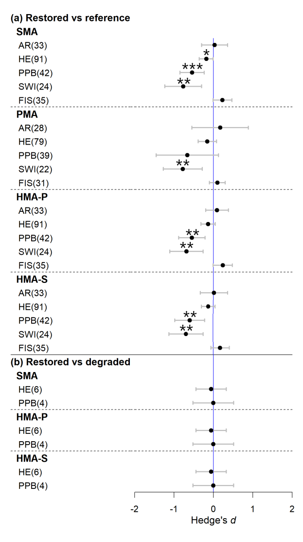 重点实验室植被生态学科团队建立了全球生态恢复种群、参考种群和退化种群的遗传变异数据库。通过数据整合和meta分析,探究全球范围内生态恢复是否促进被恢复植物种群的遗传多样性:(1)比较了被恢复植物种群与参照或退化种群的遗传多样性;(2)探索了植物特性、恢复策略和恢复时间对植物遗传多样性恢复效果的影响。