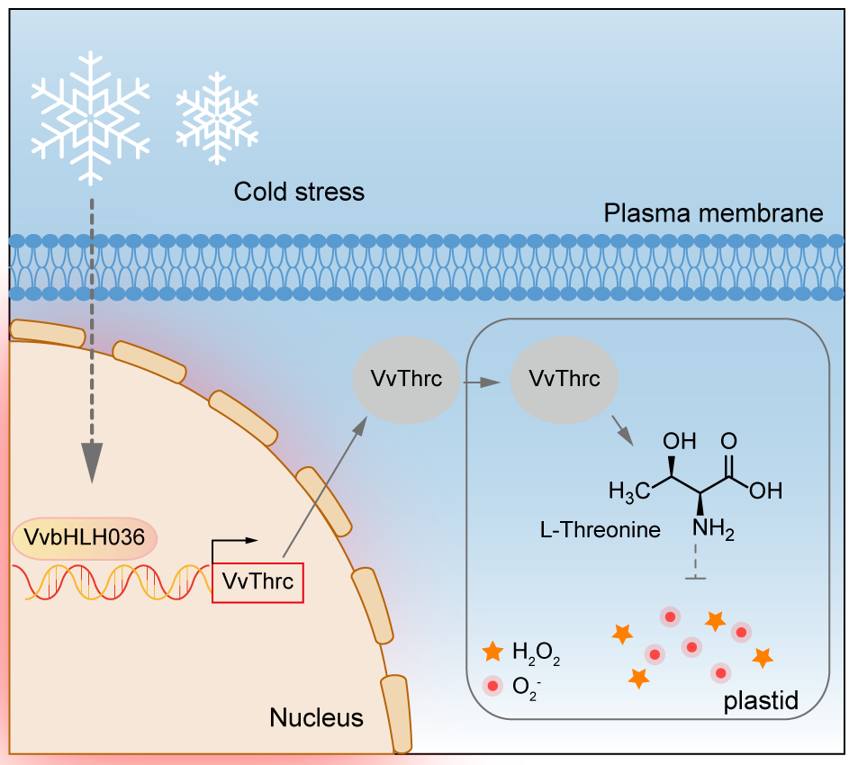 研究者通过酵母单杂交、双荧光素酶以及EMSA实验证实VvbHLH036可以与VvThrC1的启动子区域的G-box元件结合激活其表达。过表达及敲除VvbHLH036根系VvThrc1的表达及苏氨酸的含量会相应的变化。表明VvbHLH036在低温条件下通过调节VvThrc1从而调节苏氨酸含量来提高葡萄的抗寒性。低温下VvThrC1的表达及苏氨酸含量在葡萄叶片及根系中均增加。过表达VvThrC1会增加转基因根中苏氨酸的含量并增加其抗寒性,通过Crispr-Cas9技术使VvThrC1发生功能缺失后会抑制低温下苏氨酸的积累并降低根系抗寒性。外源喷施实验及DAB和NBT染色表明低温下苏氨酸通过抑制H2O2和O2-的积累增加葡萄抗寒性。