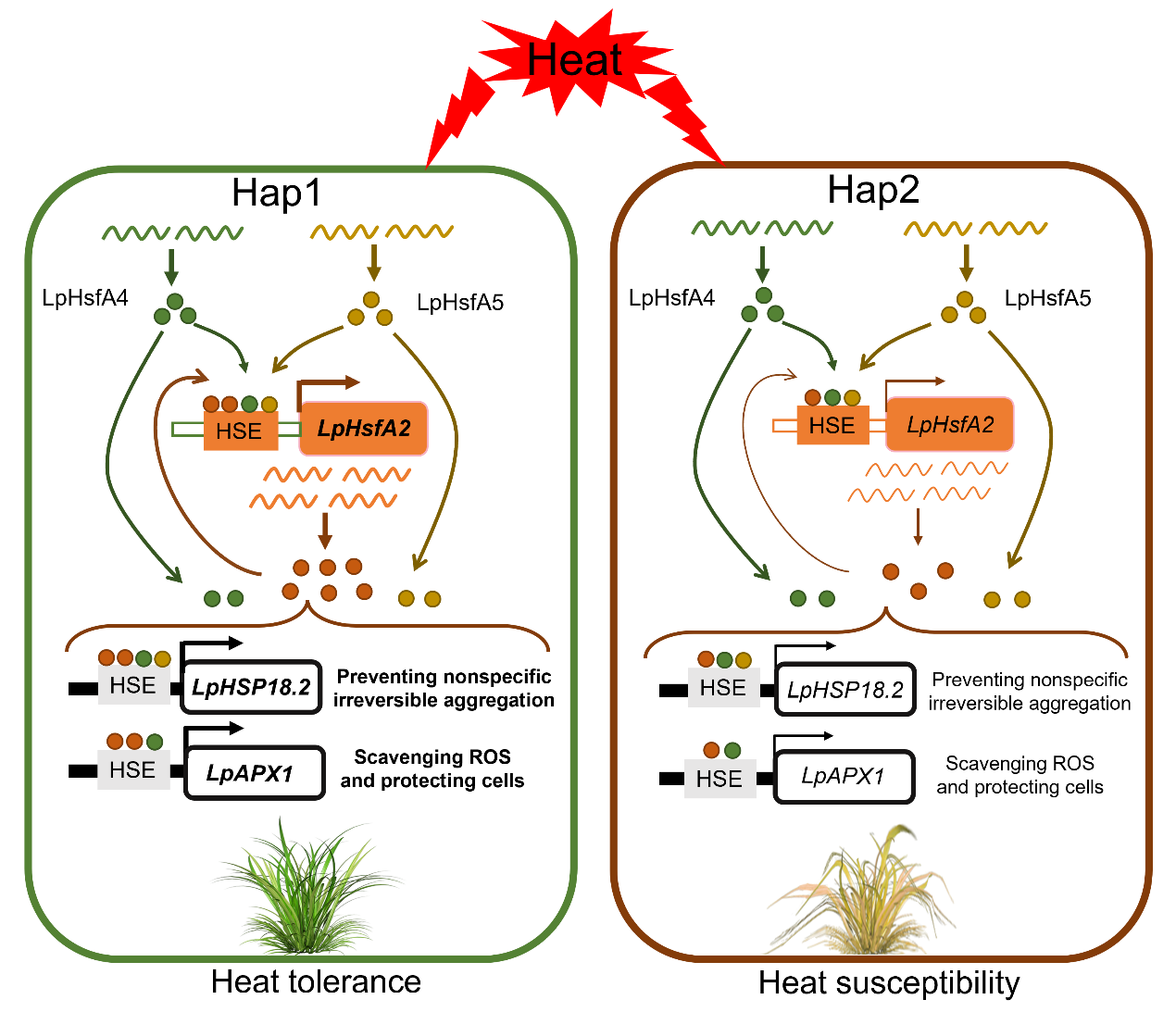 该研究发现多年生黑麦草热激转录因子LpHsfA2在高温胁迫下被快速诱导且其表达在耐热种质中显著高于热敏感种质。序列分析表明不同种质中的LpHsfA2基因编码序列保守,但启动子区域存在大量变异。候选基因关联分析结果表明,LpHsfA2启动子-439~-422 bp区域的变异与多年生黑麦草种质的耐热性显著相关。依据该区域的变异可将LpHsfA2划分为LpHsfA2Hap1和LpHsfA2Hap2两种单倍型,LpHsfA2Hap1主要存在于耐热种质中,而LpHsfA2Hap2则主要存在热敏感种质中。过表达LpHsfA2可显著提高多年生黑麦草的耐热性,而沉默LpHsfA2提高其热敏感性。酵母单杂交、双荧光素酶以及EMSA实验证明了LpHsfA2可通过直接结合LpHSP18.2和LpAPX1的启动子激活它们的表达,防止细胞内蛋白的非特异性错误折叠并降低细胞内活性氧的积累,从而协同抵御高温胁迫。进一步,通过蛋白-DNA互作技术筛选到LpHsfA2上游的正调控因子LpHsfA4和LpHsfA5,同时,LpHsfA2也可结合自身启动子正调控其表达。因此,LpHsfA2/4/5通过形成分子级联模块正调控LpHSP18.2和LpAPX1的表达,提高多年生黑麦草耐高温能力。