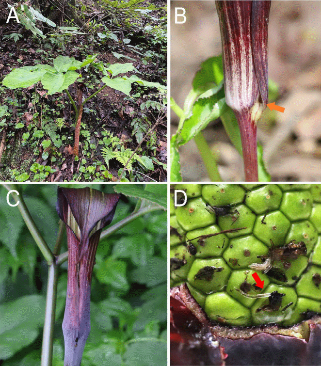 图1. 灯台莲的花序结构及蕈蚊幼虫取食成虫尸体图片。A. 自然生境中的灯台莲植株;B. 灯台莲雄花序(箭头指示花序基部的开口);C. 灯台莲雌花序(缺乏开口);D. 雌花序中的蕈蚊幼虫取食成虫尸体。