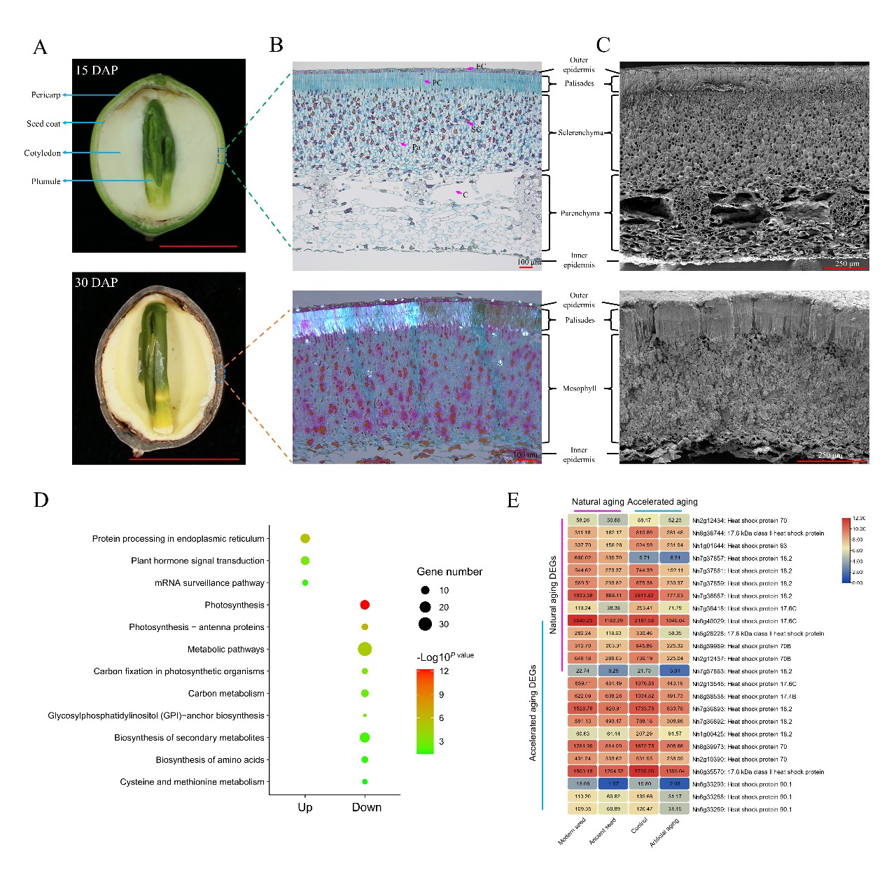 A. 莲子的结构。 B-C. 授粉后 15 天和 30 天的莲子果皮石蜡切片(B)和扫描电镜(C)图像。D. 与古莲子相比,现代莲子中上调和下调基因的功能富集分析。E. 在自然老化和人工加速老化实验中HSP基因的差异表达。