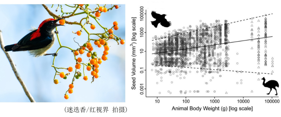 作为一类典型的动植物互作,食果互作为植物提供重要的种子传播服务,对于植物群落的繁殖更新极为关键。食果互作同样依赖动植物间的性状匹配,在协同进化下体型更大的动物倾向于取食更大的果实,以提高自身的能量获取效率。