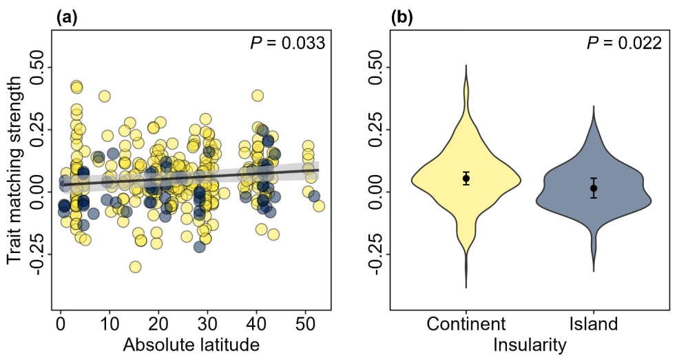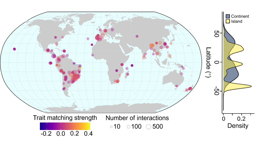 为明晰动物-肉果植物性状匹配强度的全球格局以及影响因素,课题组整合了全球354个鸟类食果网络中的22199条食果互作记录(图3),并为互作网络中的1247种鸟类和2126种植物匹配了对应的性状数据,量化了鸟类食果网络中性状匹配强度的纬度及大陆-岛屿格局。