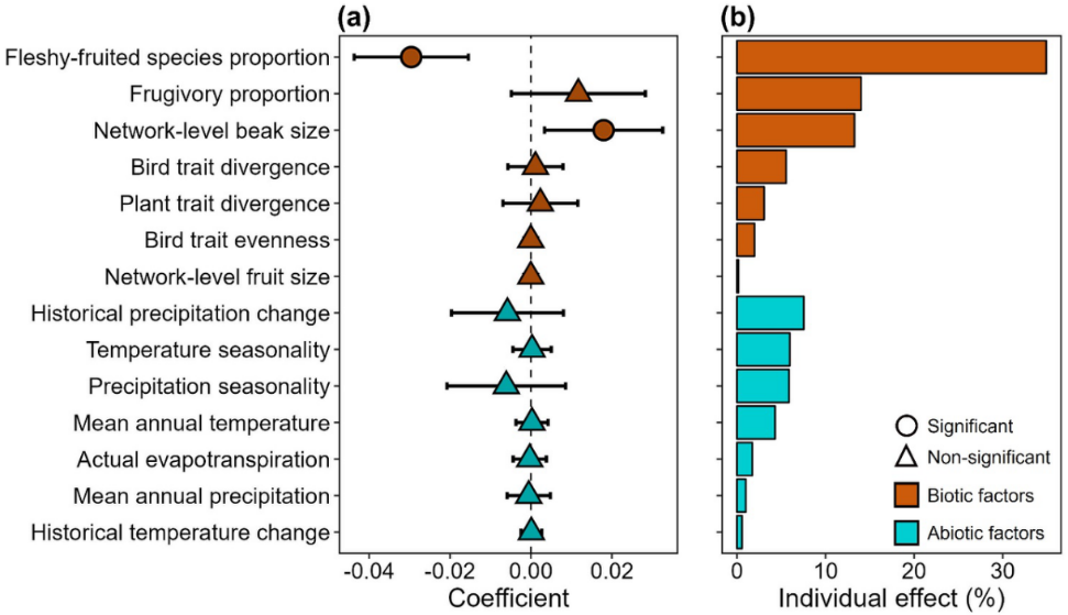 结合食果网络的地理分布及多种生物、非生物因素,研究发现鸟喙大小与果实大小的匹配在高纬度地区和大陆更强(图4),这一格局主要是由生物因素所驱动的(图5)。鸟类食谱中更高的肉果比例、食果网络更大的平均鸟喙大小以及植物群落中更低的肉果植物比例都会导致网络中更强的性状匹配。这些因素主要与鸟类在食果互作中受到的进化压力以及群落中肉果植物资源的丰富度相关。研究结果表明,食果互作中的性状匹配强度可能是由动植物间的协同进化强度及动物在资源限制下的最优觅食策略共同驱动的。同时,性状匹配强度也反映着群落中的生物互作强度,本研究验证了岛屿生物互作强度低于大陆的传统假说,但不支持低纬度地区生物互作强度更高的纬度梯度假说。