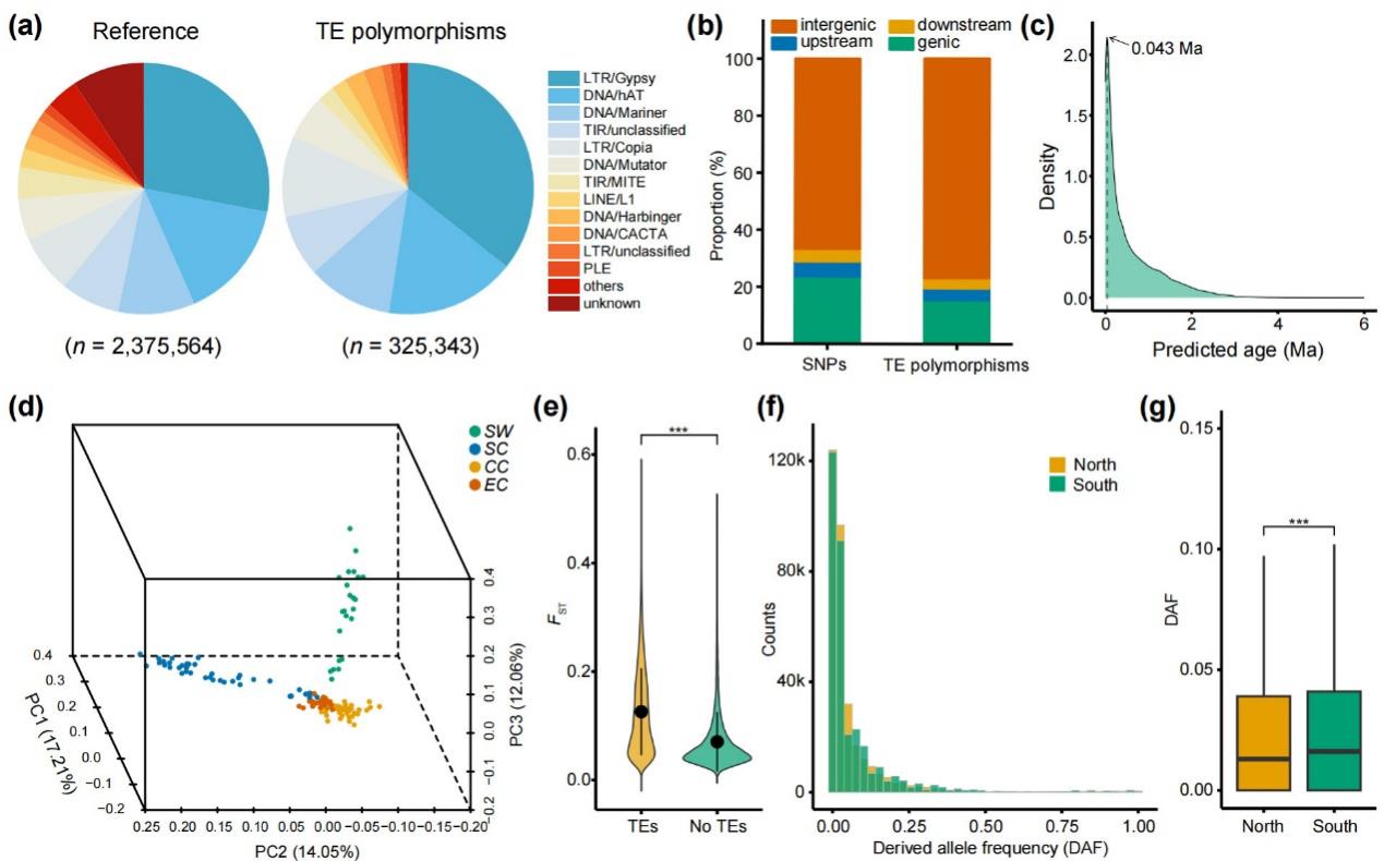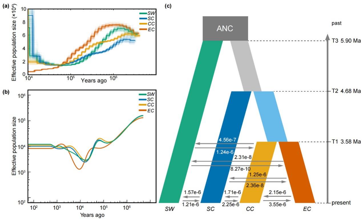 近期,该团队基于覆盖全分布区的29个异质性生境种群的重测序数据,构建了三叶青转座子变异图谱,深入解析了转座子驱动植物环境适应性进化的分子机制。基于SNPs和转座子变异位点的种群遗传结构分析一致表明,三叶青存在显著的谱系分化(图1,图2)。通过SNPs数据重建的种群动态历史表明:中新世晚期和上新世(5.90–3.58 Ma)的全球气候变冷及东亚冬季季风增强共同驱动了三叶青谱系分化,表现为南北谱系首先分化,随后形成4个亚谱系(图3)。各亚谱系在更新世晚期呈现周期性种群收缩-扩张模式。研究发现转座子变异位点的扩增始于上新世晚期(约3 Ma),而大部分位点的转座活动则发生于末次冰期(峰值约0.043 Ma)。这一结果表明,第四纪气候波动通过调控种群动态影响了转座子的活动,进而塑造了现存谱系间转座子的差异化分布格局(图1)。