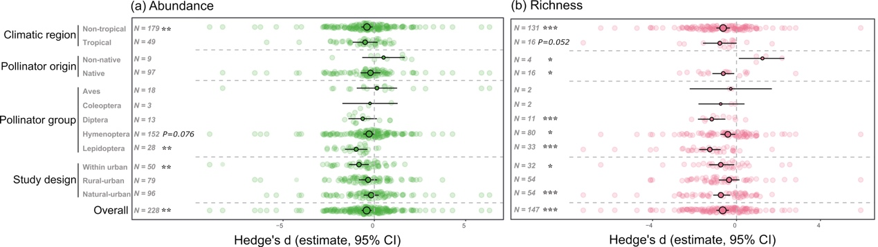 重点实验室植物繁殖生态学学科团队近年来持续关注城市环境与动植物传粉互作,系统梳理了传粉者多样性的生态价值和综合功能(Plant Diversity, 44: 429-435, 2022),揭示了城市环境对传粉者多样性和传粉服务的影响可以发生在极小的尺度上(Urban Forest and Urban Greening, 65: 127378, 2021)。近期,学科组与德国哈勒·威登堡大学合作,系统收集了全球可用数据并深入分析了城市化与传粉者多样性及传粉服务的关系,并通过对城市环境特征以及传粉者特征分析,提出了一系列可能发挥作用的因子,重点探讨了以下三个科学问题。首先,城市化对传粉者多样性的影响。与自然生境相比,城市中传粉者多度不变,但物种数显著降低;城市内部差异显著,这种差异与城市环境异质性高度有关,中等干扰程度且食物和筑巢资源丰富的生境能支持较高的传粉者多样性。不同类群传粉者响应具有明显差异,鳞翅目昆虫受影响最严重,其次膜翅目和双翅目,而鸟类和鞘翅目未受影响。值得关注的是,城市化促进了外来的传粉者,减少了本地物种,外来物种可能通过竞争花资源、筑巢地点或传播寄生虫和病原体而加剧本地野生物种的保护风险。第二,城市化对具有不同功能性状传粉者的过滤作用。城市化显著减少了地下筑巢、独居性和早春活动的传粉者多样性,但食性多寡、体型大小和活跃时长等不是显著影响因素,未来需对物候、耐热性、飞行能力等影响适应城市环境的性状展开深入研究。第三,城市化对传粉服务的影响。虽然传粉者多样性降低,但是城市传粉者仍然为城市植物提供足够的传粉服务,尤其结籽率,泛化的蜜蜂属和熊蜂属昆虫对城市化耐受程度高,对促进城市植物繁殖成功有重要意义。另外,具对称性花的植物繁殖成功显著增加,而植物来源(外来或者本地)并不影响其在城市中的繁殖成功。
