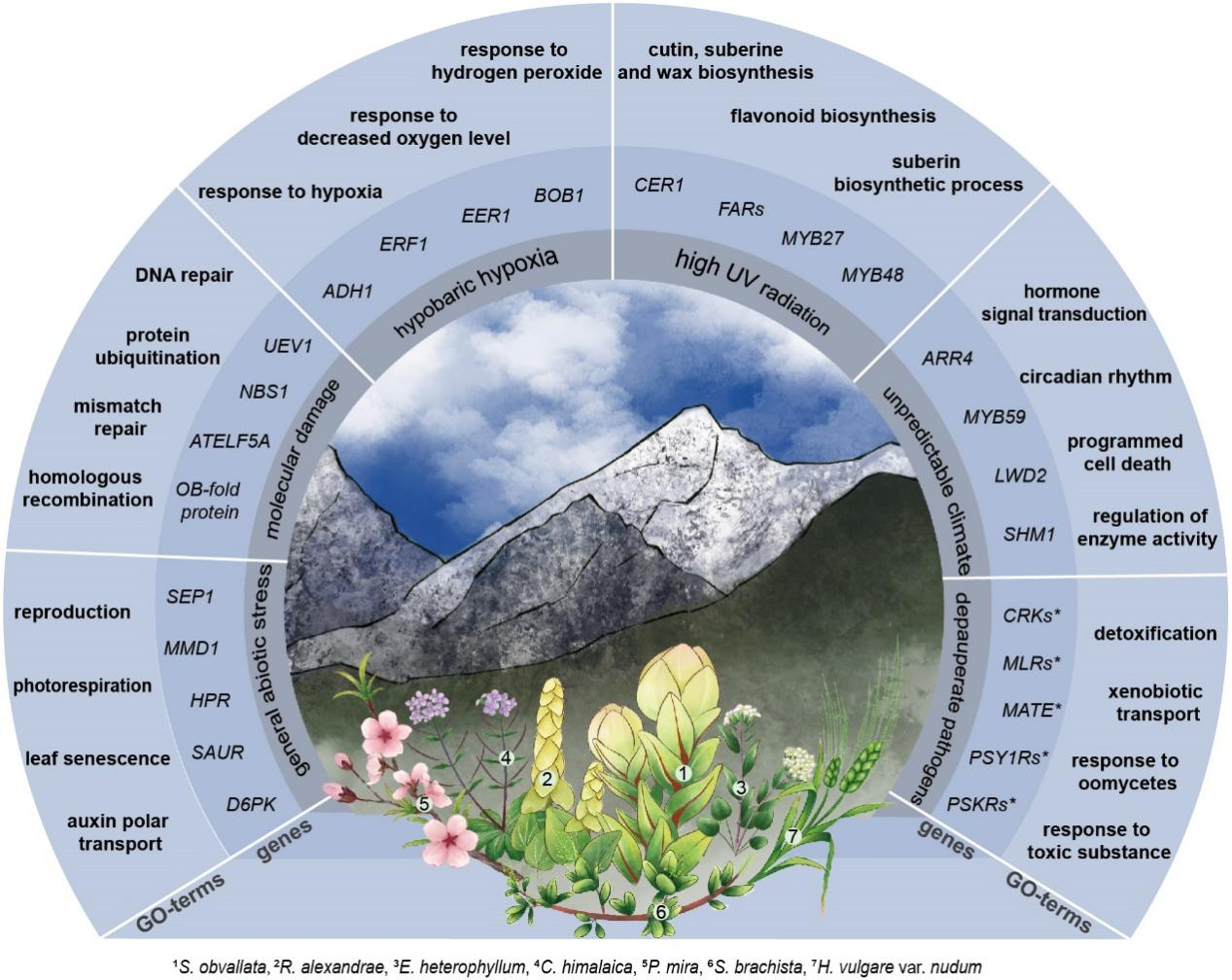 注:最内圈表示高山环境以及所研究的高山植物,往外依次显示高海拔环境胁迫、发生趋同进化的基因以及功能通路