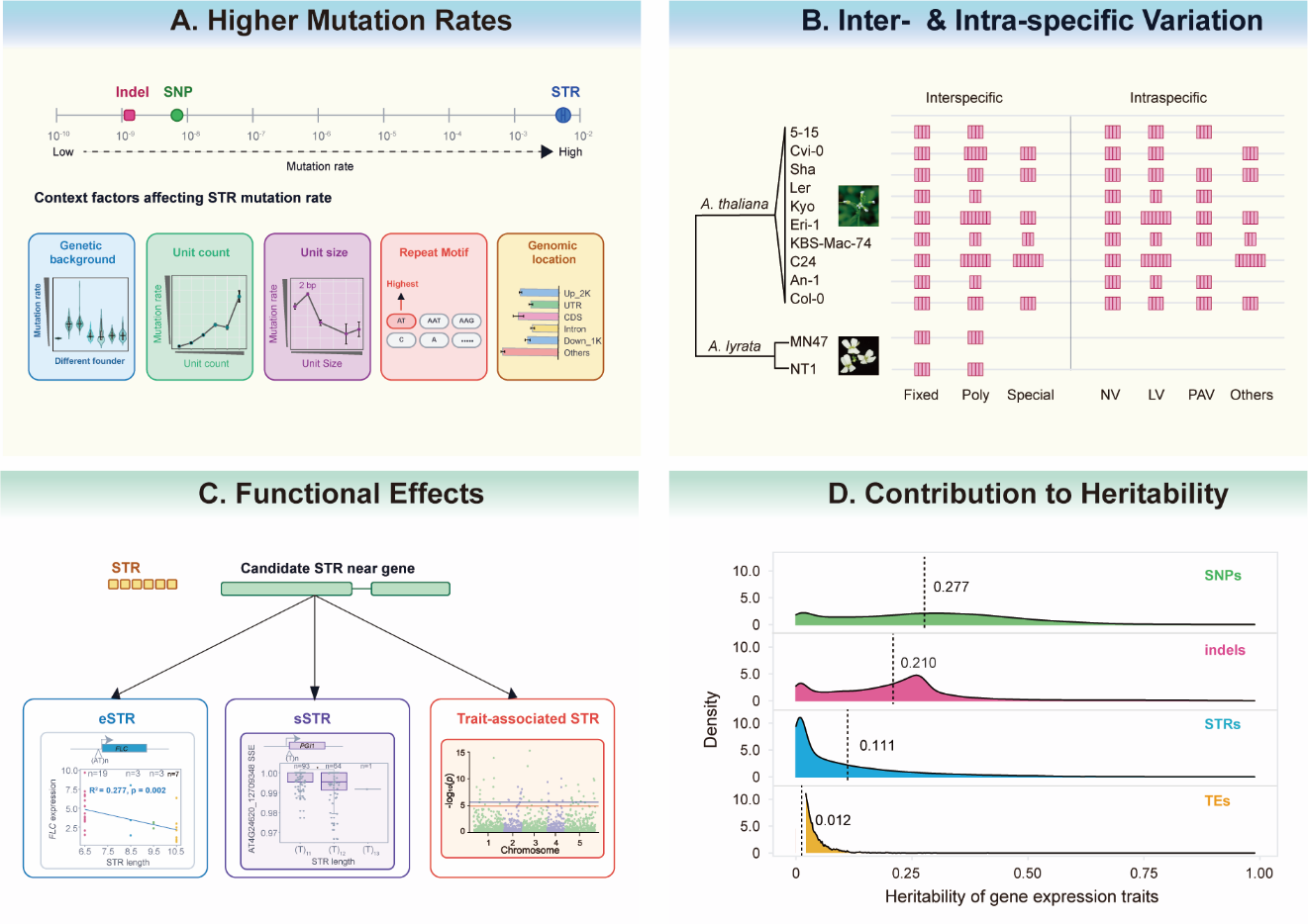 重点实验室郭亚龙团队通过对7个独立的拟南芥突变累积(Mutation Accumulation, MA)系进行分析,量化了拟南芥STR的突变率为 5.55×10⁻³ 每代每位点,显著高于单核苷酸多态(SNP)和短片段插入缺失的突变速率。这一结果表明STR在生物进化过程中可能具有重要的作用。在此基础上,研究人员利用高质量组装的基因组,对种间与种内STR的变异模式进行了系统分析,揭示了其变异的特点与规律。进一步结合全球分布的1168份拟南芥自然群体基因组数据,研究人员深入评估了STR长度变异对基因表达、可变剪接及表型的影响,并识别出一批显著关联的STR位点。最终,研究聚焦于STR对遗传力的贡献,发现STR对表达、剪接与表型变异的遗传力贡献分别为0.111、0.143与 0.101,表明STRs在复杂性状的遗传调控中具有不可忽视的重要作用。