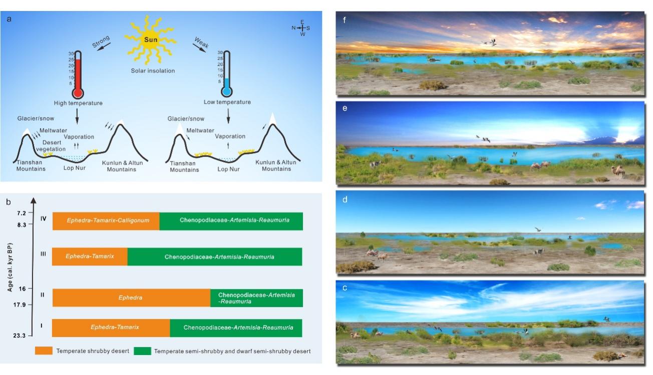 重点实验室王宇飞研究团队与地理所、中国农业大学等单位合作,依托罗布泊核心区域获取的6.17米钻孔沉积物,在可靠的年代框架下,开展了高分辨率的孢粉、粒度、碳氮同位素等多指标综合研究,重建了罗布泊地区晚更新世-中全新世(距今约23.3–7.2千年)荒漠植被演替及生态景观动态,量化了该时期温度和降水的变化,揭示了太阳活动和西风的强弱变化共同驱动了该地区的水循环,进而引发罗布泊地区温带灌木荒漠植被与温带半灌木、矮半灌木荒漠植被的此消彼长。同时,湖泊有机质来源在23.3–11.6千年以水生维管植物和浮游植物等内源为主,而11.6–7.2千年转变为内外源混合(除内源外,还包括土壤、C3陆生植物),湖泊沉积物中的氮水平主要受土壤侵蚀控制,受大气氮沉降影响较小。这些发现揭开了太阳活动和西风如何驱动罗布泊荒漠植被演替与环境变化的神秘面纱,为预测全球变化背景下亚欧内陆荒漠区未来植被与环境变化及生态系统的可持续发展提供了重要的历史参考。
