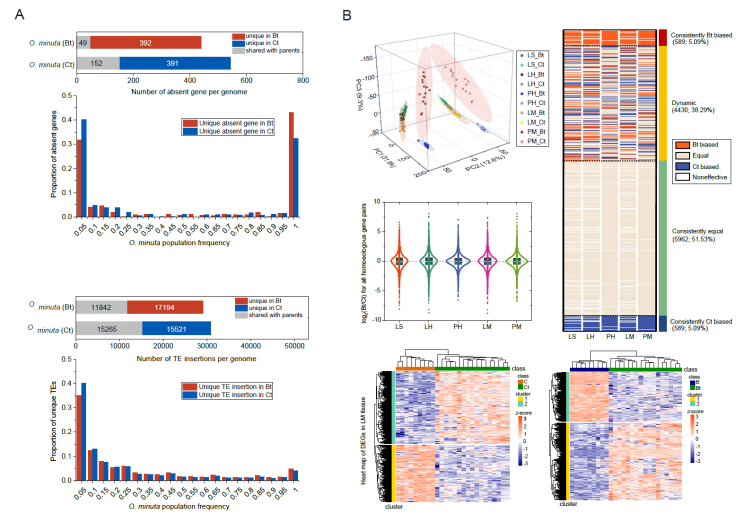 为此,重点实验室葛颂团队聚焦多倍体的二倍化过程,以异源四倍体小粒野生稻及其双亲(斑点野生稻和药用野生稻)为研究对象,在群体水平开展了从基因组序列、基因表达到形态分化的系统研究。研究人员结合PacBio CLR、Bionano和Hi-C技术组装了3种野生稻的高质量参考基因组,经基因组比较发现多倍体小粒野生稻成种于大约70万年前,至今仍与亲本保持着高度的共线性。基于广泛的群体取样和群体遗传学分析,该研究将多倍体中祖先亲本谱系的进化变异准确地区分开来,并专注于成种后的衍生变异;综合利用全基因组重测序、转录组和DNA甲基化数据,深度剖析了该多倍体的二倍化过程。结果发现,基因丢失在早期爆发,而转座子插入和部分同源交换则以渐进的方式发生,23-32%的部分同源基因呈现差异表达且具有显著的时空动态特征,但在亚基因组水平无明显的表达偏向,同质园实验也显示其表型特征未显著偏向于任一亲本。研究人员进一步就DNA甲基化、转座子分布及亲本遗传对表达式样的影响进行了分析,揭示了多倍体中转录调控的复杂性。