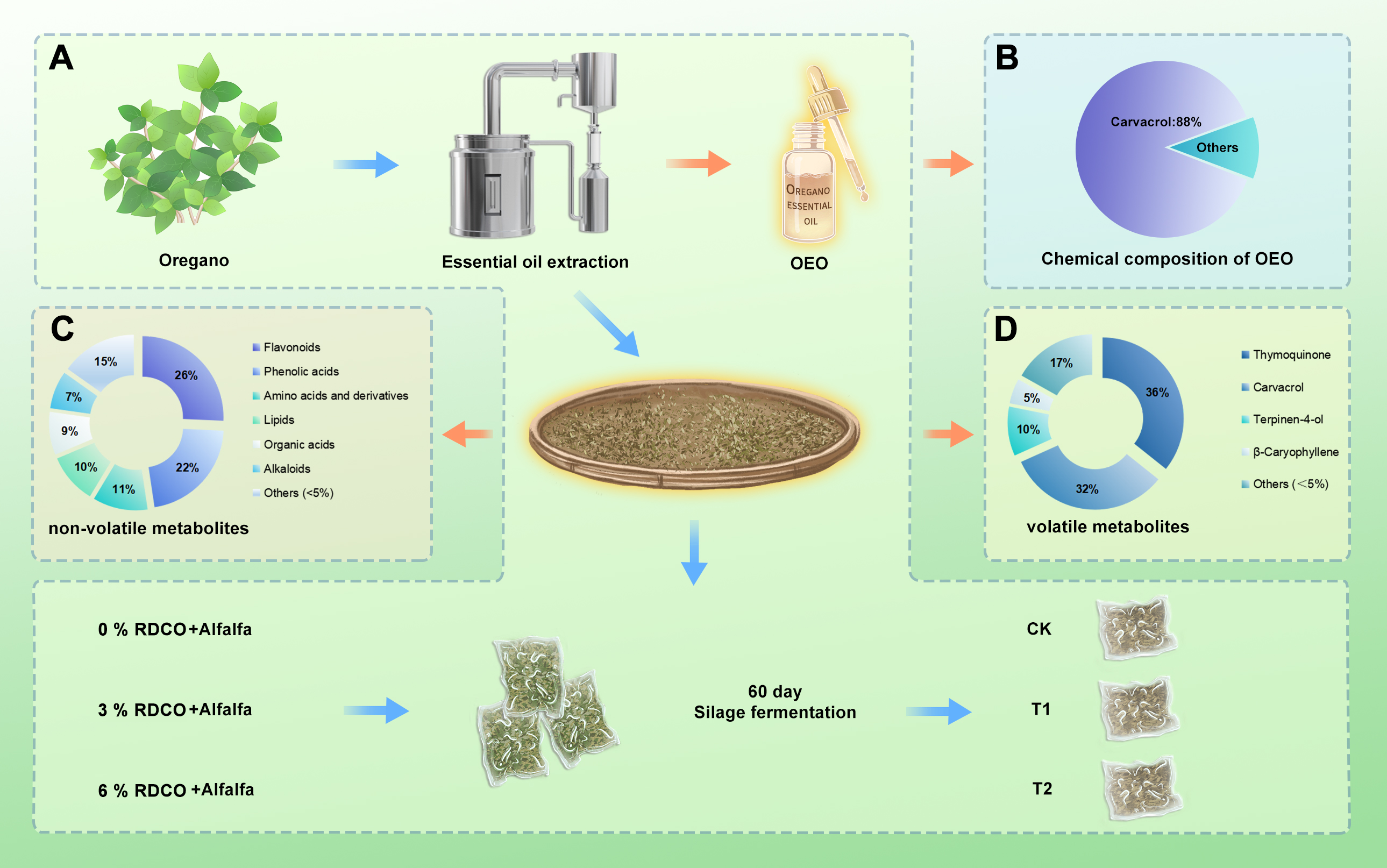 牛至精油被称为天然抗生素,在日化、医药和动物生产等领域应用广泛。牛至精油提取过程会产生大量固体残渣,比例可达90%以上。该残渣若未经有效处理,不仅会造成资源浪费,也带来环境处置压力。此外,苜蓿具有可溶性碳水化合物含量低、缓冲容量高等特性,导致其不易青贮,实践中常使用添加剂以强化青贮过程。