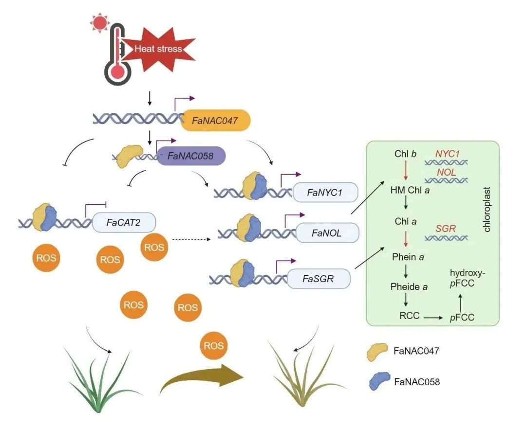 综上所述,本研究揭示了FaNAC047-FaNAC058通过协同调节叶绿素降解和活性氧积累从而调控高温诱导苇状羊茅叶片衰老的分子机制 (图1),研究结果可为培育耐高温持绿苇状羊茅新品种提供分子元件。