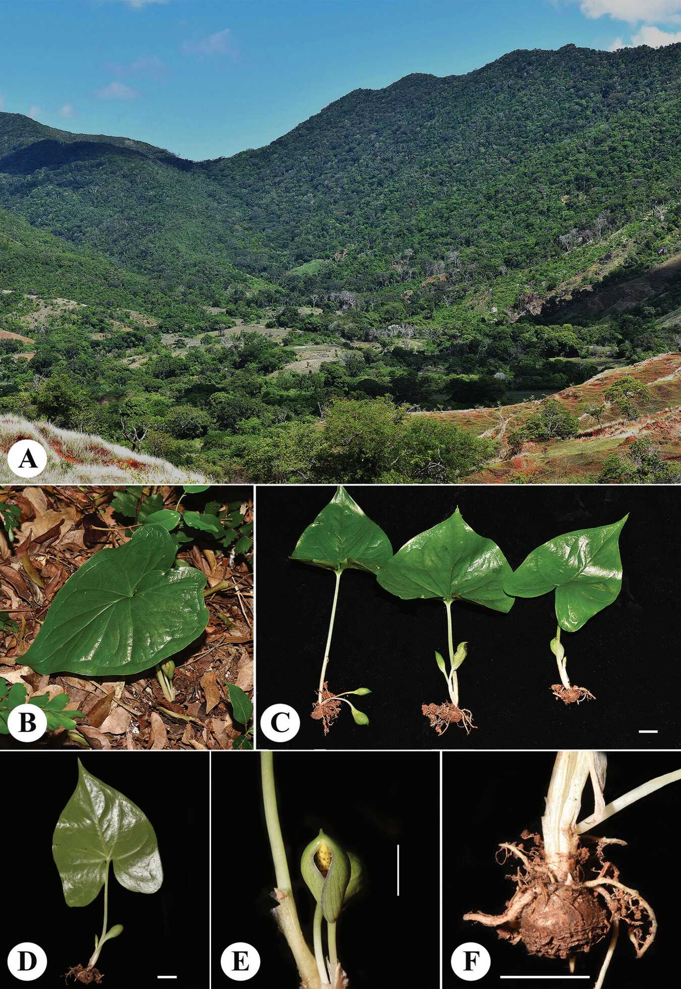 2025年1月,重点实验室植物多样性与进化研究组成员,与津巴扎扎动植物园(Parc Botanique et Zoologique de Tsimbazaza)和塔那那利佛大学(University of Antananarivo)组成联合科考队。在马达加斯加北部达莱纳(Daraina)地区进行野外本底调查期间,关注到一个林下地生的灰岩芋属居群,而该属植物通常被认为是典型的石生类型。经野外初步观察,该灰岩芋属植物叶为宽心形-箭形,与2012年在该地区发表的Carlephyton darainense相似,但其黄色的肉穗花序以及单雄蕊的雄花序,引起了研究人员的注意(图1)。考察队随即采集了足够的凭证标本、活体等研究材料。