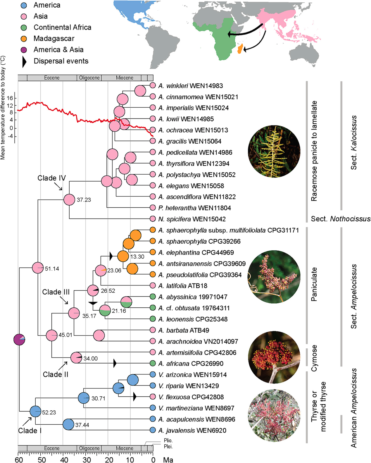 基于叶绿体和核基因的系统发生分析均支持酸蔹藤属-葡萄属分为4个主要分支,尽管分支之间和内部存在一定程度的核质冲突。这些主要分支与花序类型和花梗形态特征高度吻合,因此这些性状可作为关键的分类依据。研究进一步发现,非洲大陆的酸蔹藤属物种并非单系群,而是分别归属于花序类型不同的两个分支,且每一支系都同时包含来自亚洲和非洲的物种。基于核基因数据的生物地理学重建表明,自渐新世以来,酸蔹藤属至少经历了两次从亚洲到非洲大陆的独立扩散事件,以及一次从亚洲到马达加斯加的扩散过程(图1)。