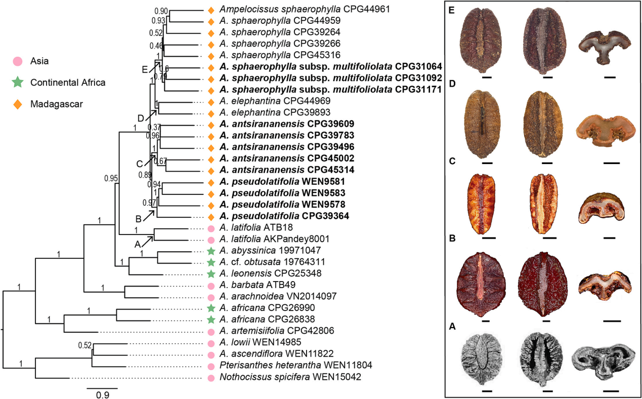 图2 基于核基因数据的酸蔹藤属系统发生关系与种子形态比较。粗体文字代表本研究描述的新分类群