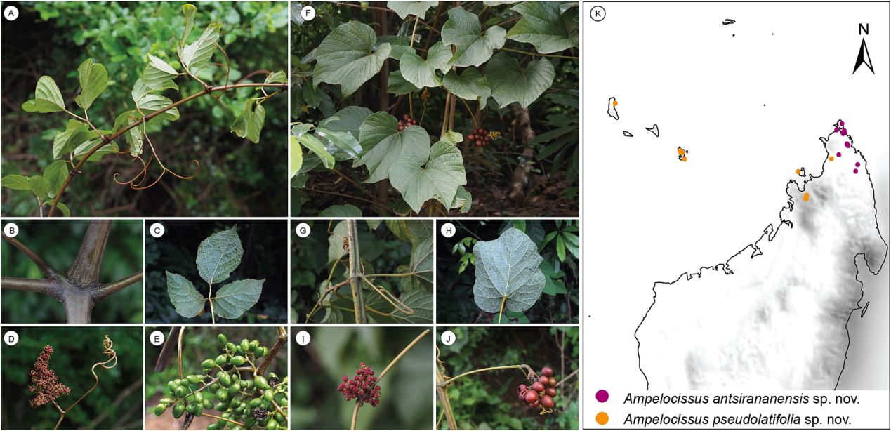 (A–E)Ampelocissus antsirananensis Rabarij. & L.M.Lu, sp. nov.;(F–J)Ampelocissus pseudolatifolia Rabarij. & L.M.Lu, sp. nov.