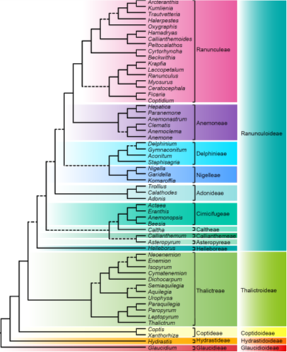 重点实验室王伟研究组及其合作者选取227个物种,涵盖毛茛科几乎所有当前认知的属以及所有可能的异名属,利用五个DNA片段为其重建了迄今类群取样最广泛的系统发育树,并通过系统发育树拓扑结构检验,确定了长期具有争议的白根葵亚科、黄根葵亚科和毛茛亚科侧金盏花族的系统位置,澄清所有属的范围,尤其是异质的银莲花属、扁果草属和鸦跖花属被重新界定、划分。结合形态数据,研究人员为世界毛茛科提出了一包括5亚科、14族和58属的新分类系统(图2)。其中,建立了1新族3新属。